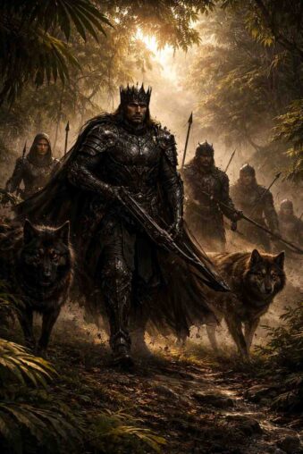 The wounded king lies defenseless as enemies surround him in the dark jungle